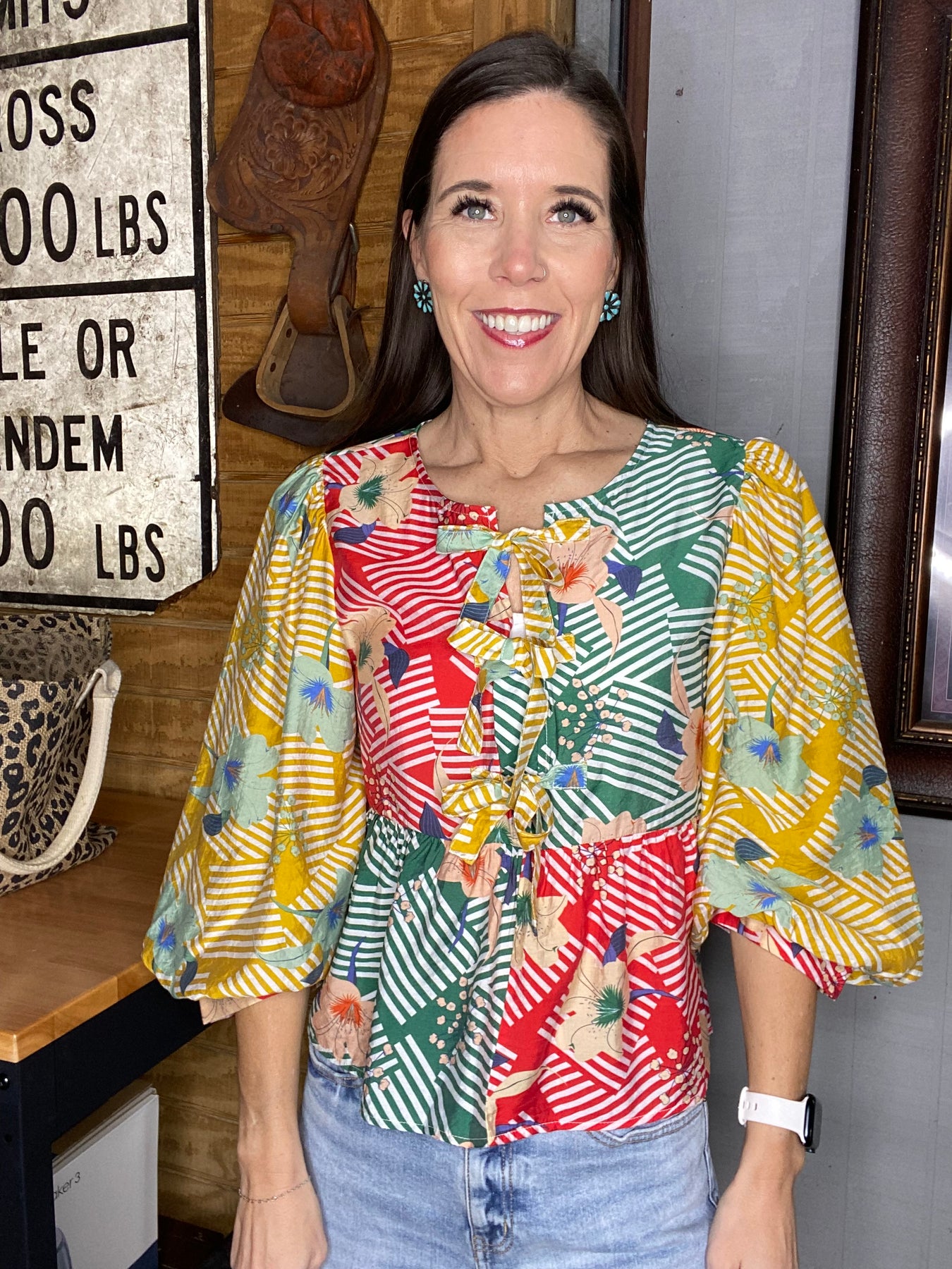 This multi color + print top is perfect for Spring! It will pair well with so many color options of bottoms!